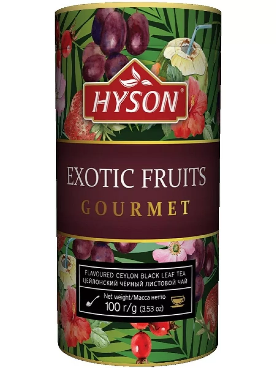 Чай крупнолистовой черный HYSON Exotic Fruits 100 гр в жестяной тубе — настоящий цейлонский премиальный продукт с добавлением с добавлением изюма, шиповника, гибискуса и клубники с ароматом тропического пунша. Высший сорт. Эмблема «Золотого льва» является подтверждением того, что чай выращен, собран и упакован на острове Цейлон. Производство Шри-Ланка. Чай подарочный Хайсон будет всегда радовать вас, ваших родных и близких.